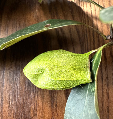 8月散歩中に木の葉の裏に山繭を見つけました、よく見ると足元に空の繭が転がっています、羽化して出たのでしょうね、初めてまだ繭の中にいるのを見ました。